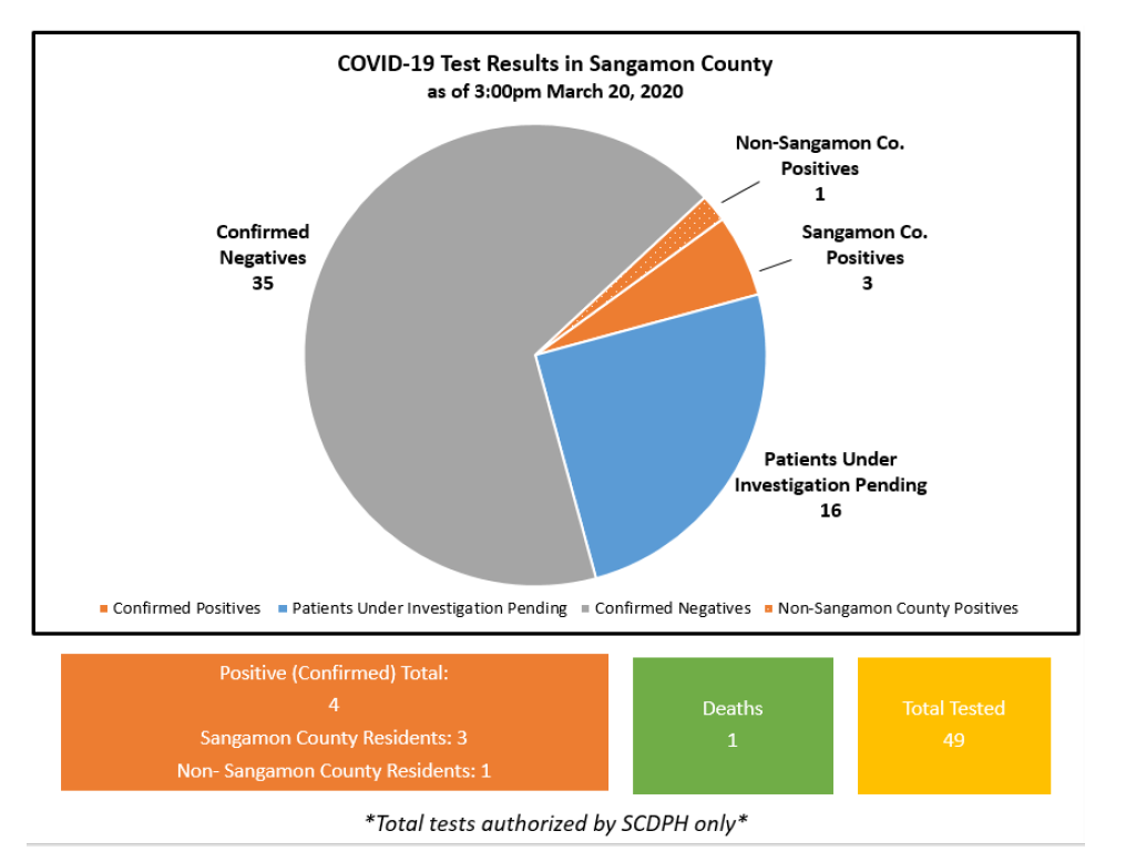 This is a daily joint communication from the Sangamon County Department of Public Health along with Memorial Health System, HSHS St. John’s Hospital, Springfield Clinic and SIU Med-icine updating you on the status of coronavirus (COVID-19) in Sangamon County. This commu-nication will come at approximately 6 p.m. each day as necessary.