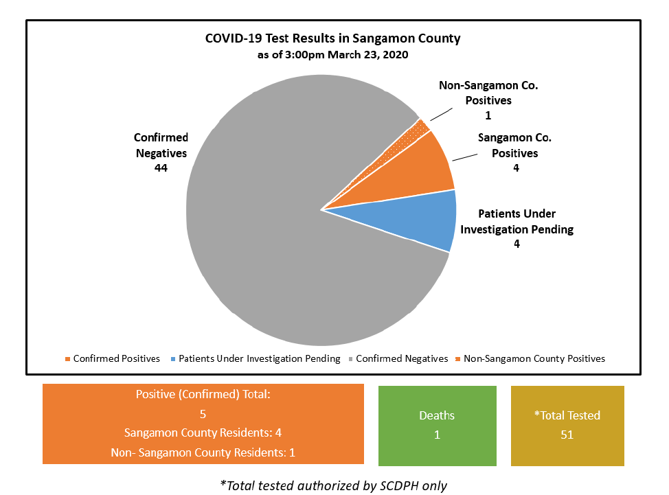 At the time of this press release, we are announcing one new positive case in Sangamon County. The total number of confirmed cases between our five organizations is five, including one death. Currently, all of the active cases are no longer hospitalized. *These numbers indicate current inpatient numbers at hospitals in Sangamon County. They do not include the status of testing conducted in private labs.